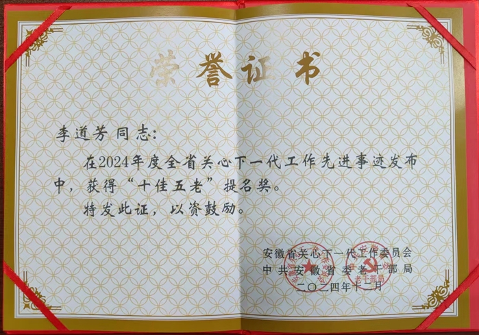 2月28日下午,合肥市关工委2025年度工作会议在市政务中心召开。会上开展了合肥市关心下一代工作“双十佳两示范”(双十佳:十佳工作集体、十佳“五老”;两示范:示范“五老”工作室、示范工作品牌)命名工作,我校关工委荣获“十佳先进集体”。此外,在2024年度全省关心下一代工作“十佳五老”先进事迹发布活动中,李道芳教授荣获提名奖。