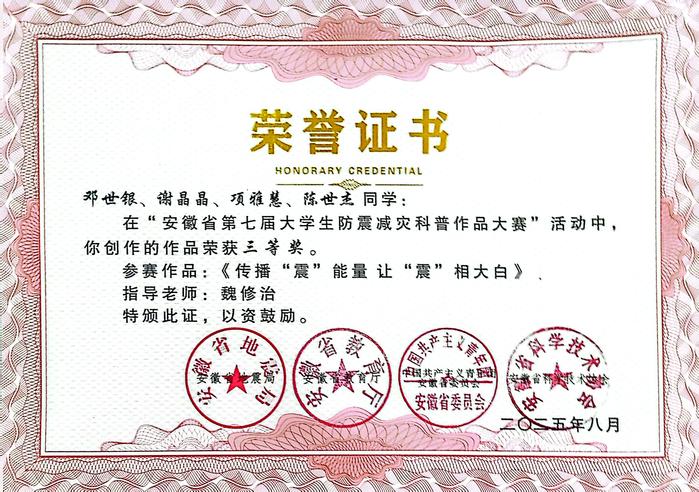 近日,由安徽省地震局、安徽省教育厅、共青团安徽省委员会、安徽省科学技术协会联合主办的安徽省第七届大学生防震减灾科普作品大赛结果揭晓。我校学生作品《传播“震”能量,让“震”相大白》获省级三等奖。
