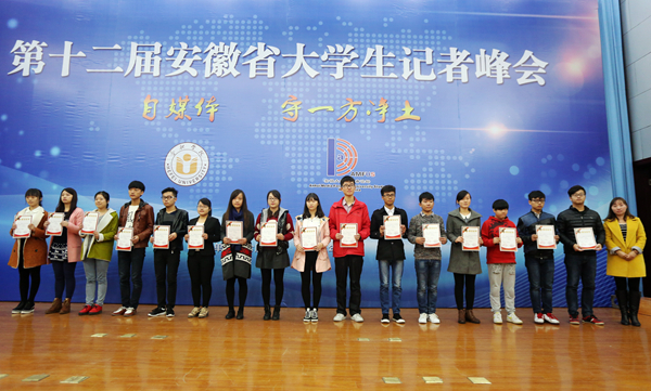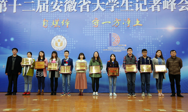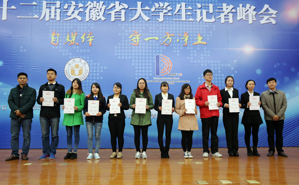随后,2015年安徽省校园十佳新闻记者、2015年度安徽省高校校园“好新闻奖”获得者、峰会“自媒体 守一方净土”主题征文比赛获奖名单公布。主题征文获奖代表、2015年度安徽青年报《大学生周刊》“十佳”学生记者和 “十佳”学生记者站依次上台领奖。校园“好新闻奖”通讯类一等奖获得者安徽农业大学姚安琪和消息类一等奖获得者安徽师范大学皖江学院李玲玲分别上台发表讲话。