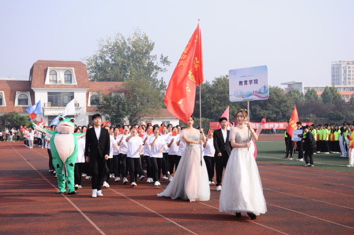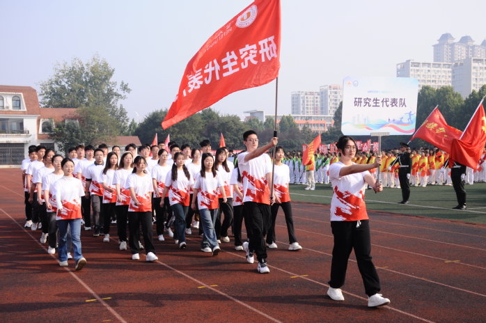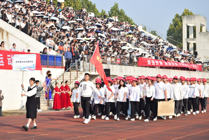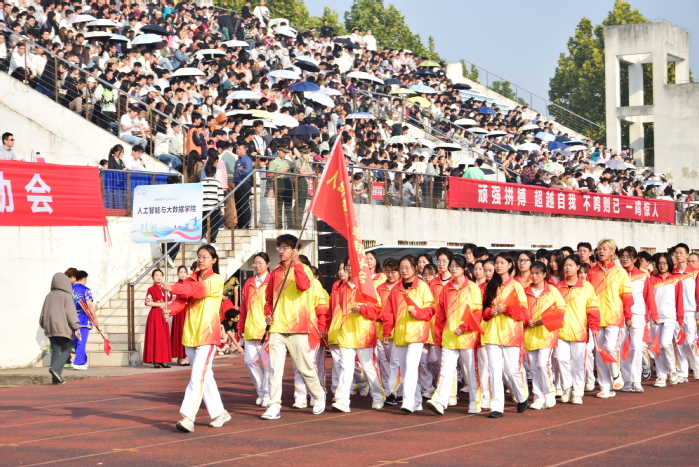 校国旗队方阵托举国旗率先入场,伴随着雄浑壮阔的《运动员进行曲》,各二级学院、留学生、研究生代表队紧随其后,迈着铿锵有力的步伐依次走过主席台前方。戴着红色建筑安全帽的城市建设与交通学院方阵队昂首阔步向前,能源材料与化工学院方阵携化学元素周期表尽显专业风采。“先进制造、制造先进,勇往直前、永不言败”“信笃志坚、奋勇争先,外院学子、拼搏向前”……响亮豪迈的口号声此起彼伏。整齐的步伐、挥舞的旗帜,展现着全校运动健儿们团结向上、奋力拼搏的精神风貌。