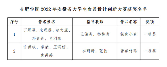 12 月 11 日,“皖酒·华东生物”杯安徽省大学生食品设计创新大赛决赛在蚌埠举办。我校推选的作品《轻食小卷》《青莓竹玛》获一等奖,我校获优秀组织奖。
