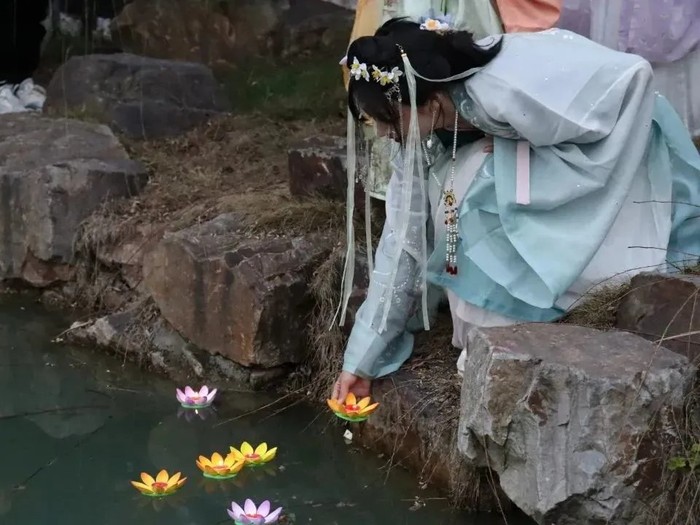春日傍晚,学生们身着各式汉服,手持花灯,展示着“服章之美”。衣袂翩翩,宛若惊鸿,巡游队伍像一幅唯美的古典画卷在校园内徐徐展开。正值春色满园,巡游队伍在艺术楼前开展了十二花神走秀和舞蹈表演。伴随着优美的旋律,十二花神广袖飘飘、衣袂摇摇,为大家呈现了一场精彩的视觉盛宴。夜幕降临,五颜六色的莲花河灯被放入湖面,灯光水影摇曳,如繁星点点。此次花灯节还特别设置了书法、绘画、投壶、赏灯等活动,为同学们带来了多元体验。盛开的丁香与端庄的汉服交相辉映,绘出了一幅校园三月春景图。