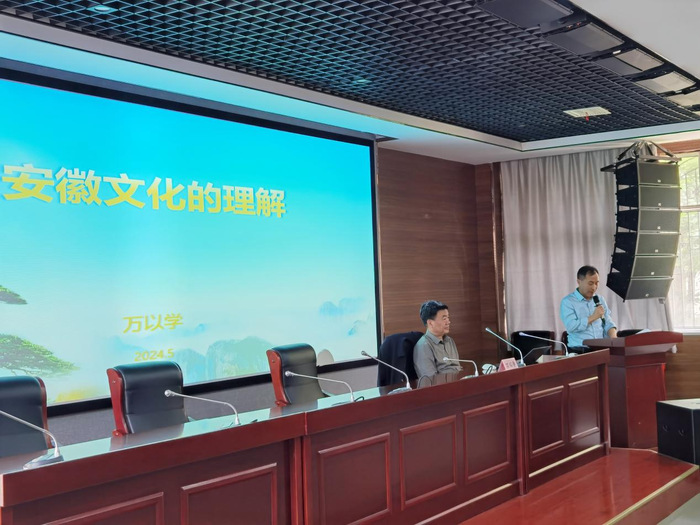 万以学从“地理环境与文化生成”“舆地沿革与文化传承”“时空交织与文化蝶变”“融旧铸新与文化迭代”等方面以朴实的语言和典型事例阐述安徽文化源流和发展脉络,并就文化传承、文化资源挖掘及创新发展等方面与师生进行分享交流。
